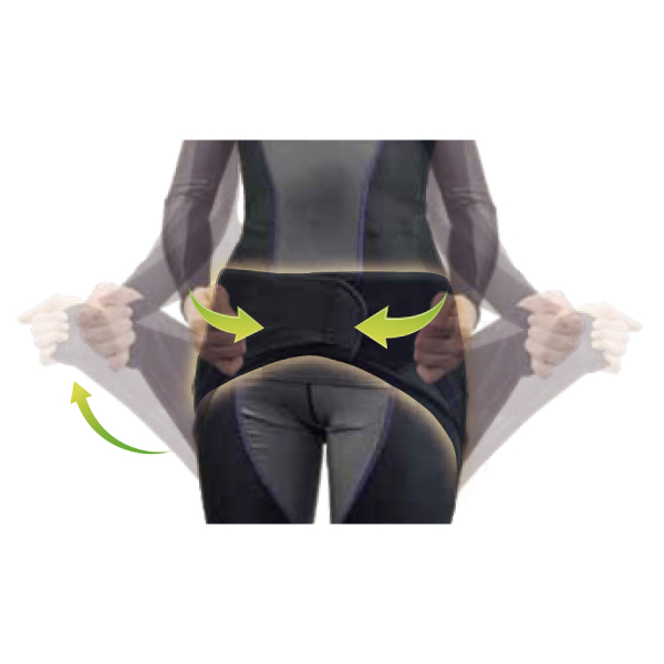 もも裏から腹部にかけて締め込むことで骨盤を安定させて正しい姿勢に導き、腰を安定させます。圧迫の強さは面ファスナーで調節が可能です。